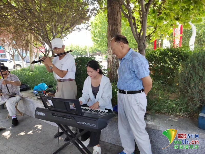 图为实践队员在兴隆尚府社区帮唱歌的老人弹伴奏。中国青年网通讯员 王屹兵 供图?