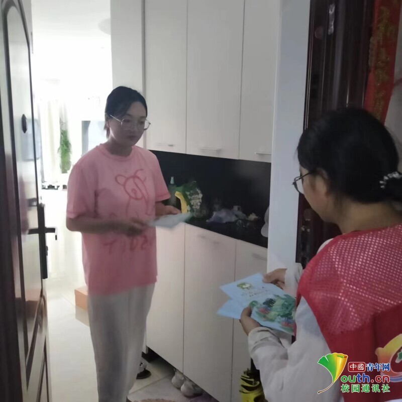 图为实践队员在天成锦江苑社区入户发放“垃圾分类”宣传手册。中国青年网通讯员 王屹兵 供图